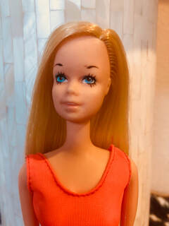 The latest edition to my Barbie collection! Dressed in a tricot tangerine one-piece swimsuit, the 1977 "Barbie and Her Super Fashion Fireworks" gift set #9805, was a Kresge (Kmart) exclusive. Each pack had four colorful outfits, and with three fashion packs produced, added up to twelve cute outfits. One set included fashions #9552, 9559, 9560 and 9561; a. second set had #9550, 9553, 9556 and 9558., and the third set included #9551, 9554, 9555 and 9557. In 1976, they were called Sweet 16 fashions.