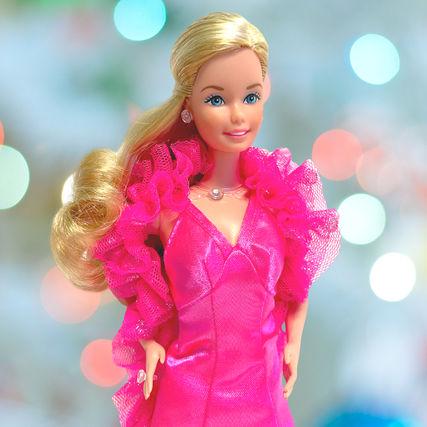 In honor of this doll’s 45th anniversary, a vintage SuperStar Barbie reproduction debuted in 2022 for adult collectors. “Superstar Barbie reflected all of the glitz and glamour of the disco era,” Bill recalls. This reproduction (repro) doll is dressed in a fabulous pink evening gown with a glittering ruffle boa. Sparkling “diamond” jewelry and matching pink heels complete her glamorous look. This doll uses the same Superstar face sculpt that was introduced with the original doll. The SuperStar Barbie face mold stayed in the Barbie line for more than 20 years! 1982 Twirly Curls Barbie, 1978 Pretty Changes Barbie and 1984 DreamTime Barbie are examples with the same face sculpt as SuperStar Barbie.